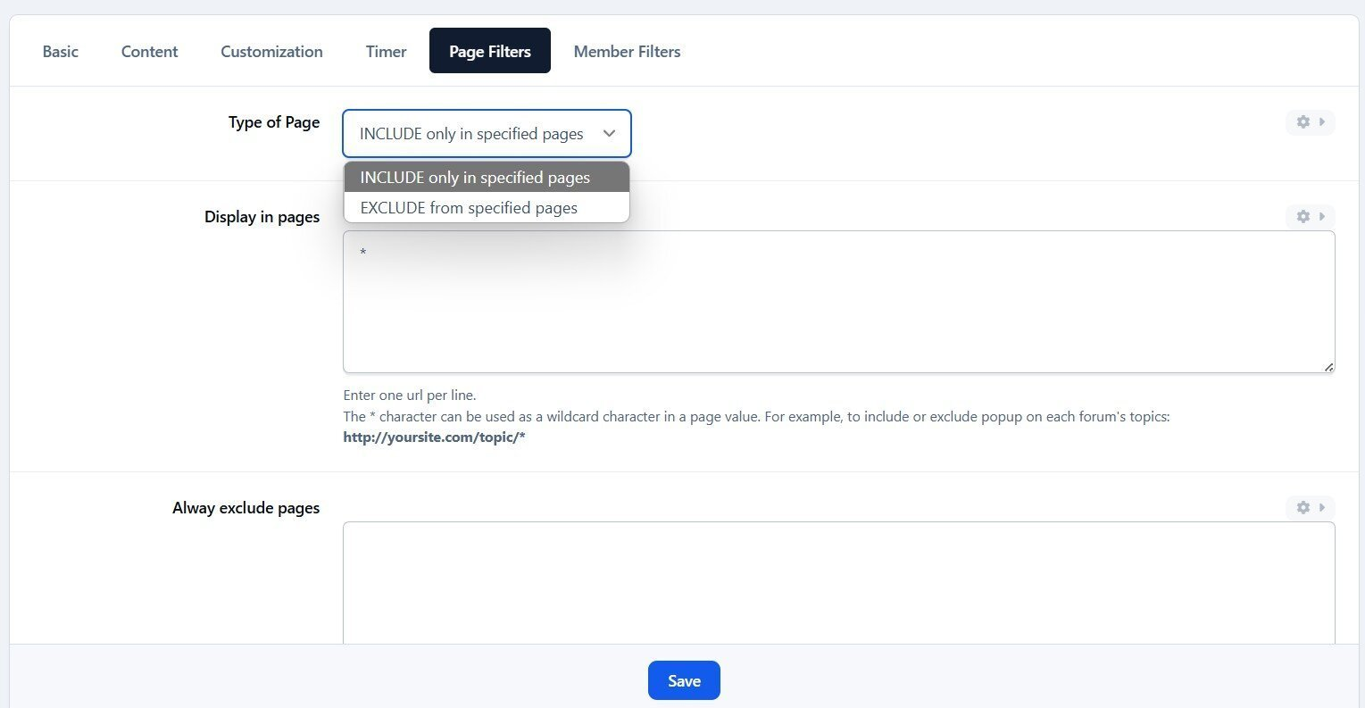 Dễ dàng thiết lập URL cụ thể để hiển thị cửa sổ bật lên.