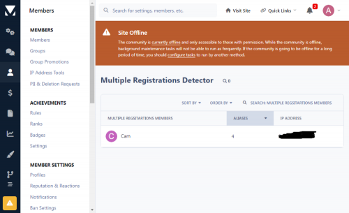 This method is based on scanning the members table for members who have registered more than one account at your forum from the same ip. The ip address in question will be displayed with the latest multiple account. When the ip address is clicked upon, it will display all the other aliases of that member.