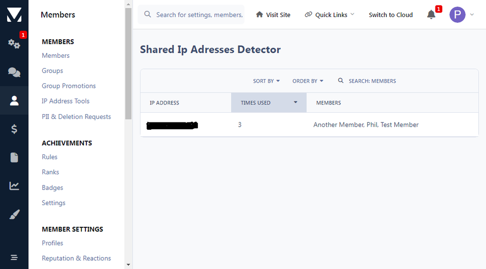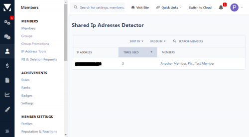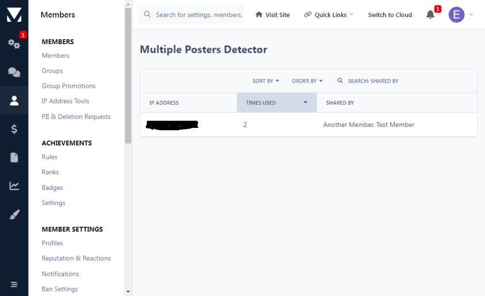 Phương pháp này dựa trên việc quét bảng thành viên để tìm những thành viên đã đăng ký nhiều hơn một tài khoản trên diễn đàn của bạn từ cùng một IP. Địa chỉ IP được đề cập sẽ được hiển thị cùng với nhiều tài khoản gần đây nhất. Khi nhấp vào địa chỉ IP, tất cả các bí danh khác của thành viên đó sẽ được hiển thị.