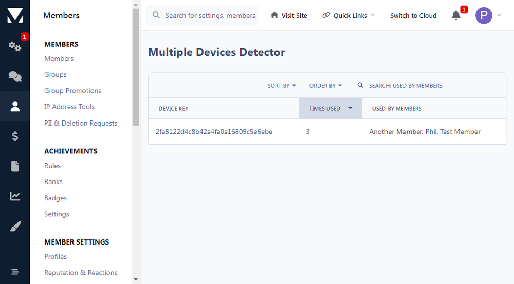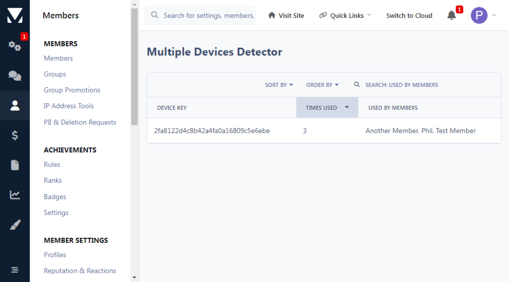 This is the most accurate method imo. Ipb adds a unique cookie to members devices when they log in to the forum. The cookie expiration date is set to one year and its unique string is associated with the users device and stored in the device table. This means if someone logs in to your forum, logs out and then logs in using another account and a different ip address, then it can tell that it was the same person. It means that person has to use same machine, same browser irrespective of the ip address he/she is using.