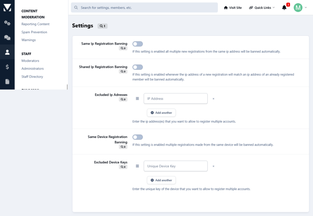 Tất cả người dùng cố gắng đăng ký nhiều tài khoản bằng cùng một địa chỉ IP hoặc thiết bị có thể bị cấm tự động khi đăng ký. Quản trị viên có thể loại trừ địa chỉ IP và thiết bị khỏi việc bị cấm.