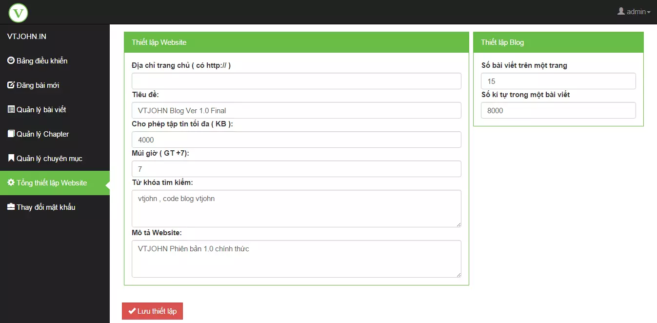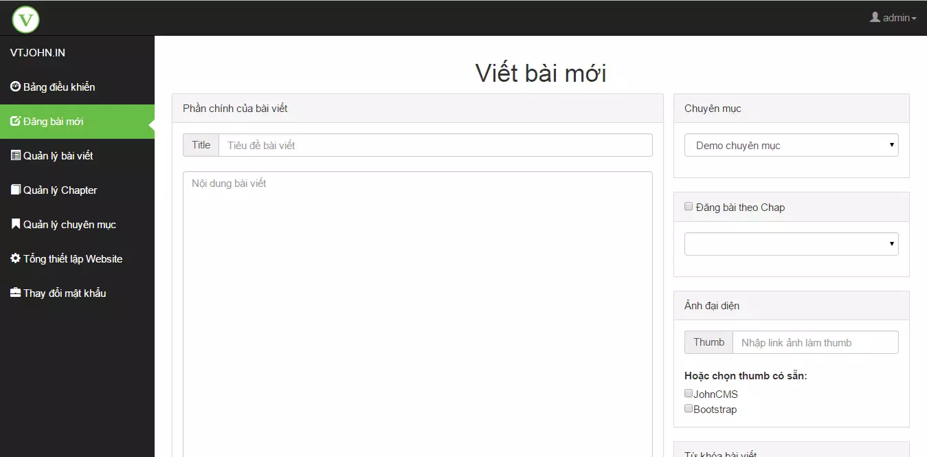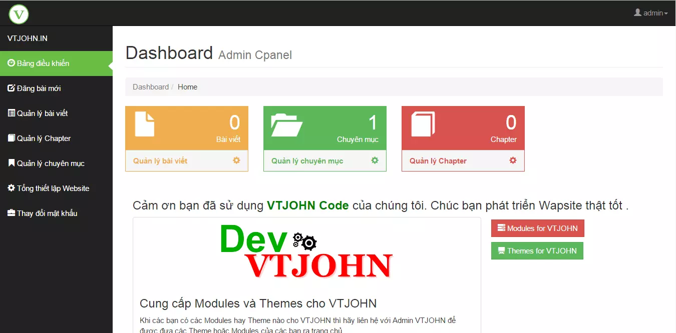 VTJOHN là bộ Code được chỉnh sửa và bổ sung thêm từ mã nguồn JohnCMS với nhiều tính năng hấp dẫn cho nên cũng được coi là một bản Mod từ Johncms mà ra. Nhưng nó sẽ được phát triển thêm với các Modules và Theme bổ sung đi kèm. Các tính năngGiao diện sử dụng Boostrap 3 tinh tế cộng với công nghệ Responsive làm cho Website tự động co giản theo độ rộng của màn hình. Code nhẹ, load nhanh và ít gây hao tổn tài nguyên máy chủ. Hệ thống đăng bài viết thông minh, hỗ trợ nhiều lựa chọn cho việc đăng bài. Chức năng đăng bài viết theo từng Chap phù hợp hới Blog truyện. Xem mục lục của Chap và chức năng xem bài viết tiếp theo của Chap ngay trong bài viết. Chức năng Seo từ khóa thông minh, Seo thẻ ..., Hệ thống quản lí Admin Cpanel chuyên nghiệp. Hình ảnh Code by Thạch Nhanhnao.xyz Download vtjohn-1-final.zip