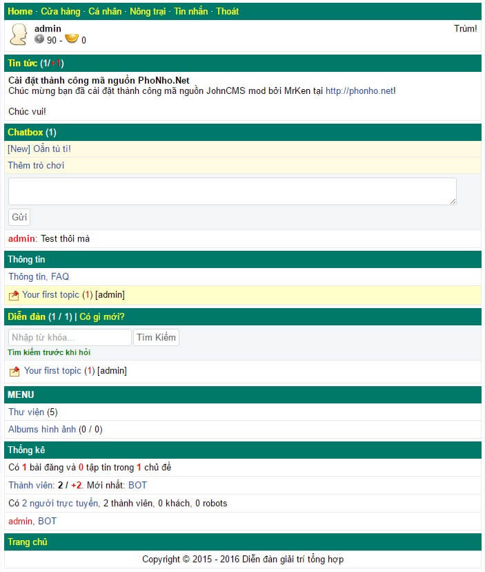 Tính năng Đã mod các tính năng cần thiết cho diễn đàn Giao diện xanh lục nhẹ đẹp Tối ưu hóa Seo Chức năng cơ bản Load nhanh, nhẹ Vân vân và mây mây... Ảnh Demo Cài đặt Upload code lên host và giải nén. Tạo Cơ sở dữ liệu mới (MySQL Databases) và Import file data.sql Vào incfiles/config.php và config các thông số Cuối cùng, đăng nhập diễn đàn bằng tài khoản admin - 123456 Tải xuống phonho.zip